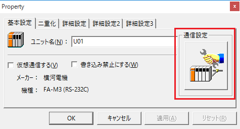 3.追加されたユニット(U01)のプロパティを開き、通信設定をクリックする