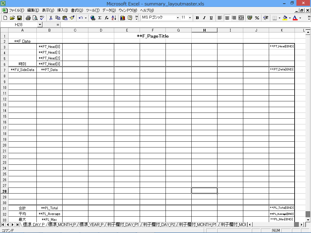 日報、月報、年報の印刷レイアウトの設計は、「レイアウトマスタ」を定義することによって行います。レイアウトマスタはMicrosoft ExcelのExcelファイルそのものであり、Excelによって作成する必要があります。レイアウトマスタは、用紙サイズ、列数、文字書式、罫線などを必要に応じて好みのレイアウトに変更することが可能です。