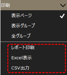 •レポート印刷 ・・・指定されたレポート(日報など)の印刷を行います。 •Excel表示 ・・・指定されたレポートをExcelファイルで表示します。 •CSV出力 ・・・指定されたレポートデータをCSVファイルとして保存することができます。