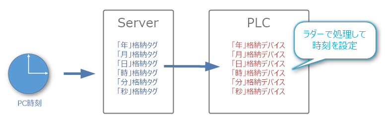 時刻同期アクションはPLC(タグ)へPCの時刻情報を書き込む機能です。年~秒までの情報を別々のタグに書き込み、PLC側のラダーで、書き込まれた日付情報をPLCのフォーマットに合った時刻に処理して、時刻の同期を行います。