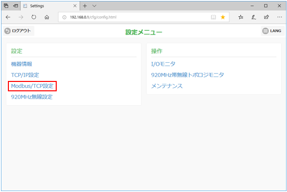 5.Modbus/TCP接続時のポート番号を変更する場合は、「Modbus/TCP設定」を押下する