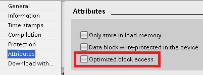 データブロック(DB)を使用する場合、直接アドレスを指定する形となります。S7-1200/1500を使用する場合、シンボル名などでアクセスすることは出来ないため、オプティマイザを解除する必要があります。