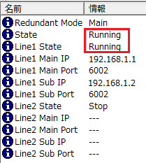 1.メイン機アプリケーション、サブ機アプリケーションの順にオンライン化した後に、メイン機アプリケーションのRedundancyインターフェースの情報を表示させ、「State」と「Line1 State」が共に「Running」になっていることを確認して下さい。
