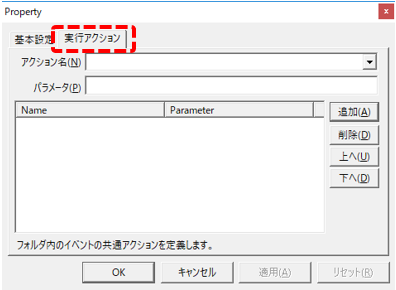 プロパティページから、「実行アクション」タブを開きます。