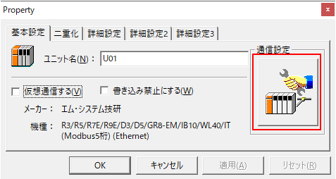 3.追加されたユニット(U01)のプロパティを開き、通信設定をクリックする