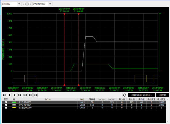 以下の例では、U01.F01.D0003、D0004の2点のアナログタグ、M0000の1点のビットタグの値がグラフ上に表示されています。