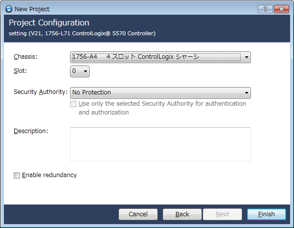 4.環境に合わせて、シャーシなどのその他設定を行い、設定完了後「Finish」を押下する