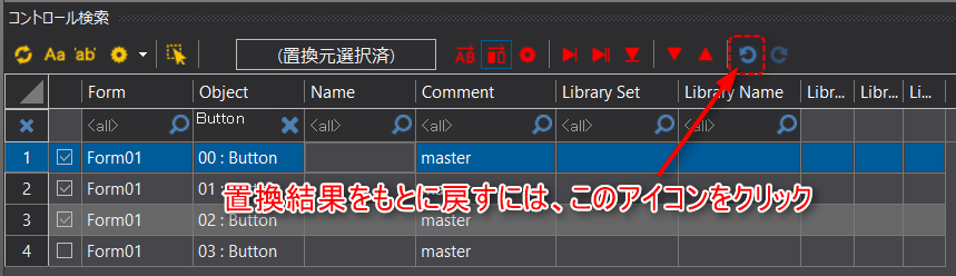 << Click to Display Table of Contents >> マニュアル > 画面作成ガイド > Panel Editorの高度な編集機能 > コントロール検索 > コントロール検索の置換操作(オブジェクト) |