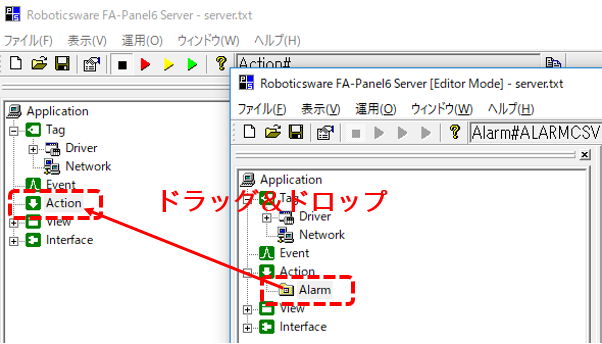 この状態で、サンプル側のPanel ServerのActionの下に登録されている「Alarm」アクションを、現在作業中のPanel Serverの「Action」の上に、ドラッグ&ドロップします。