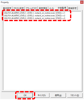 上記の設定により、CM2の定義が1、2、3(つまり、軽故障、中故障、重故障)のアラームのうち、アラーム発生または未確認のアラームが1件でも存在する場合に、1つめのパラメータで指定したタグにTrueが書き込まれます。
