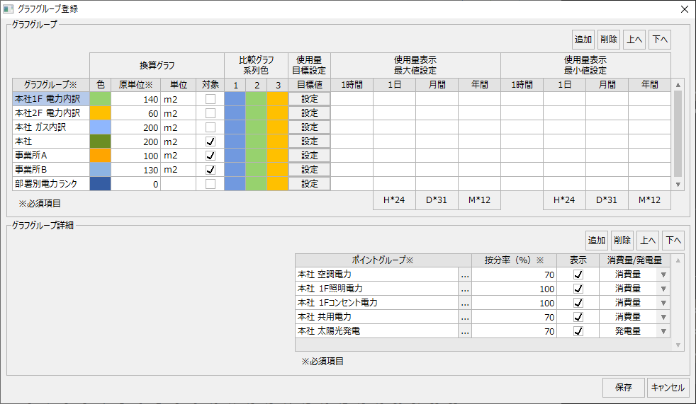 グラフグループの登録では、グループに含めるポイントグループ、各グラフの表示色、原単位、使用量の目標値の設定などを行います。