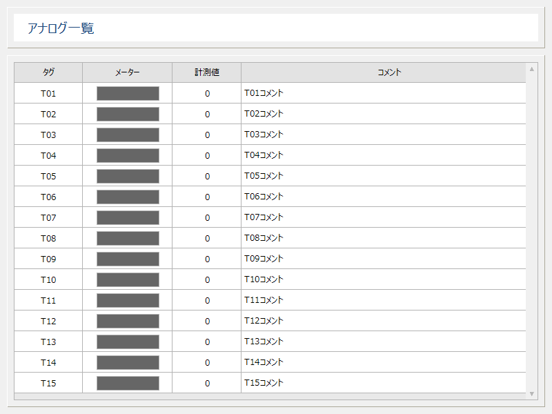 タグ名、メーター表示、計測値、コメントを一覧形式で表示するアナログ一覧画面の作成手順を紹介します。