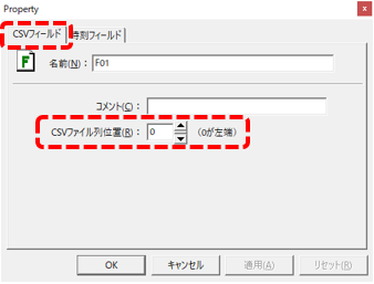 CSVフィールドタブでは、フィールドの名称と、CSVファイル内での列の位置を指定します。
