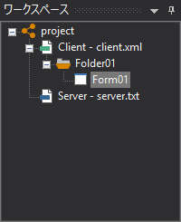 画面左上のツリー選択ビューには、クライアント設定ファイル(client.xml)とサーバ設定ファイル(server.txt)が表示されています。