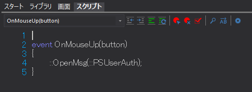 4.このボタンには、権限キー「key1」の値を取得する処理を記述します。ボタンのスクリプトページを開き、OnMouseUpイベントを追加します。