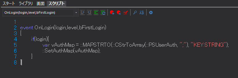 OnLoginイベントは、ログインが行われる都度発生するイベントです。ログインが行われると引数「login」にTrueが渡ってきます。従って、本イベント内に処理を記述することで、ログインが発生する都度、上記の処理が自動的に呼び出される動作となります。尚、PSUserAuthルートプロパティは、ログインが行われる都度、当該ユーザに定義されている権限設定が文字列で格納されます。