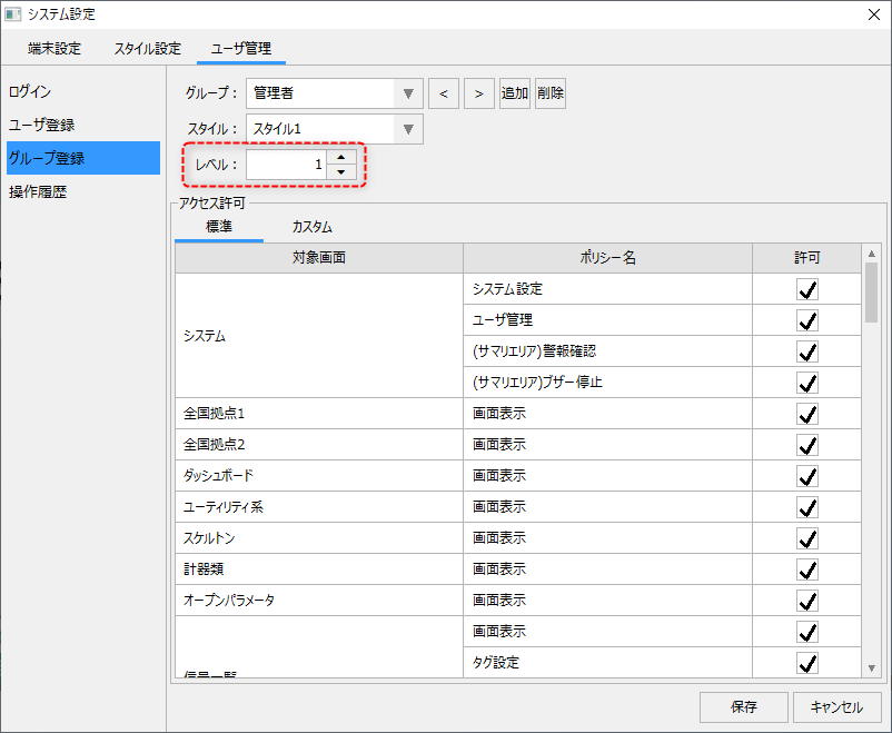 ■標準のユーザ管理機能のユーザレベル設定