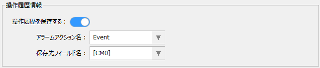機能を有効にするには、「操作履歴を保存する」を有効にするとともに、連係させるアラームサーバのアクション名をコンボボックスから選択し、操作履歴のメッセージを保存するためのアラームのフィールド名をコンボボックスから選択してください。