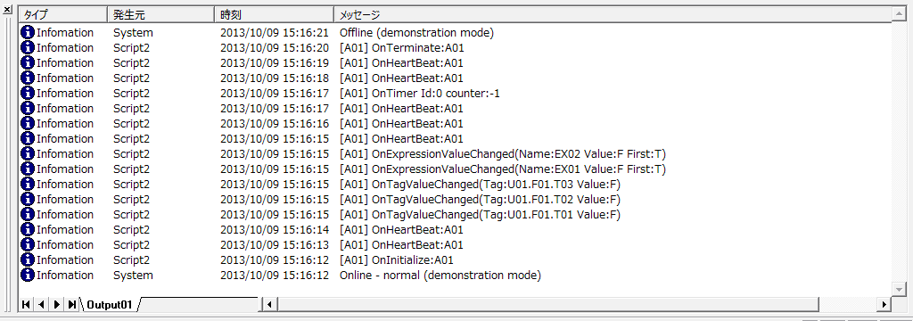 オンライン後、Output01にスクリプトの動作結果がログとして出力されます。