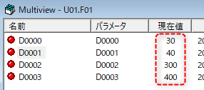 同じく、U01.F01.D0001にタグを書き込むと、D0003に10倍された値が書き込まれます。