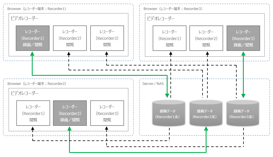 以下は、複数台のクライアントPCでレコーダー端末を構成した例です。