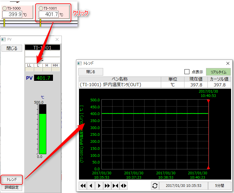•フェースプレートから、チューニング画面、詳細画面を表示することができます。詳細画面では警報の有効/無効などの設定を運用中に変更することができます。