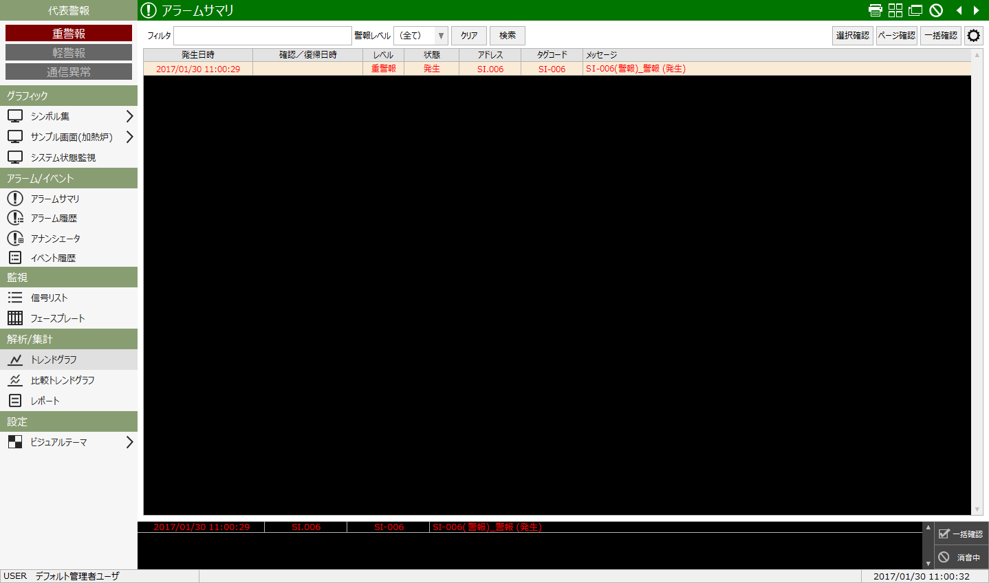 •画面下部のリストには、常に現在発生中のアラームが表示されます。