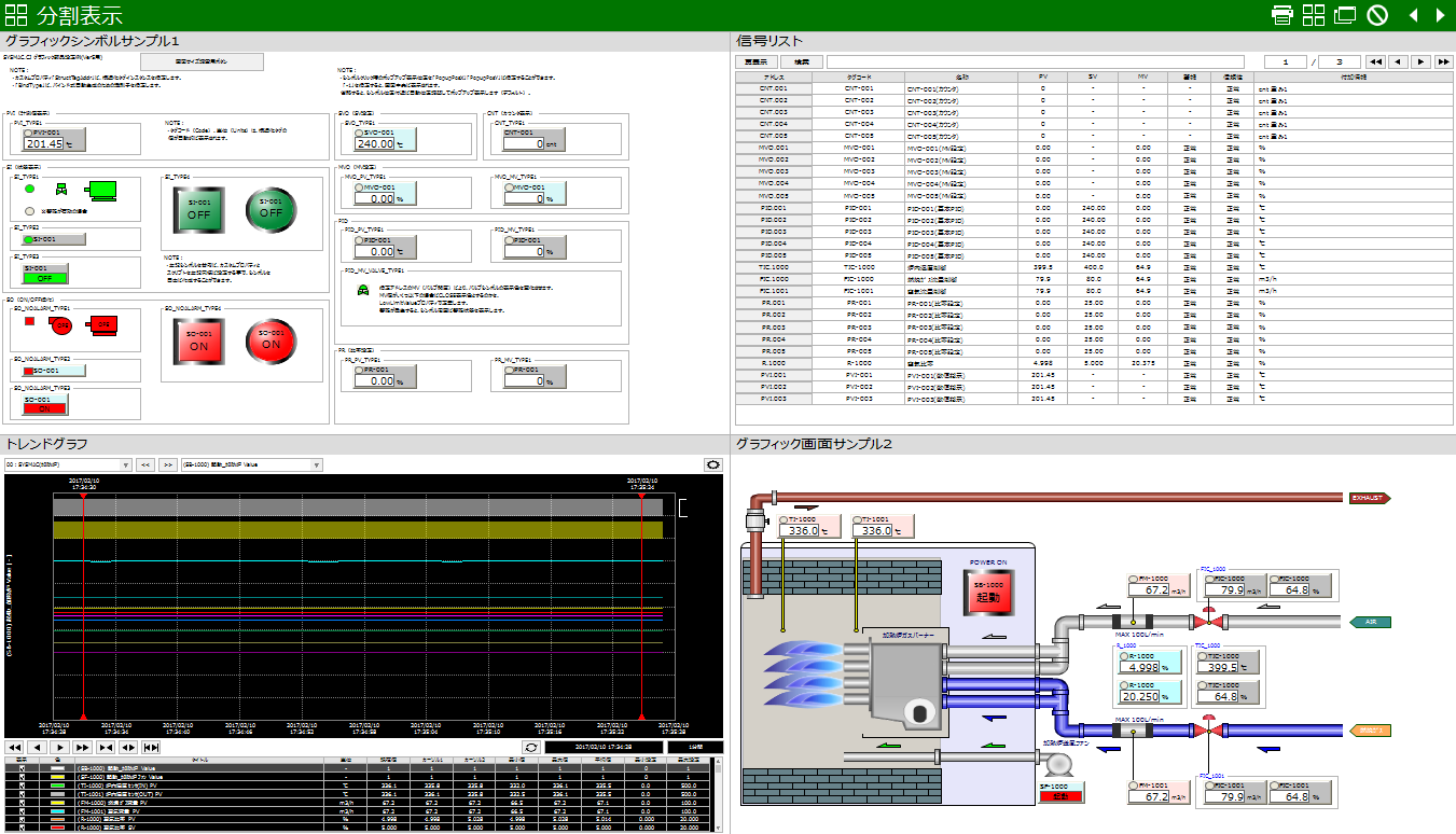 実際にデモンストレーションサンプルの画面に触れていただく事で、本パッケージが標準的に提供する各種機能をお試しください。尚、デモンストレーションサンプルには、集計データや履歴データのサンプルデータも含まれています。履歴データの日時指定にサンプルデータを指定することにより、グラフ画面にデータを表示することもできます。