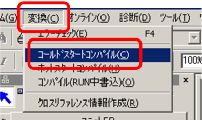 13.続いて、PX-Developerからコールドスタートコンパイルを行います。PX-Developerのメニューから、「変換/コールドスタートコンパイル」を選択してください。