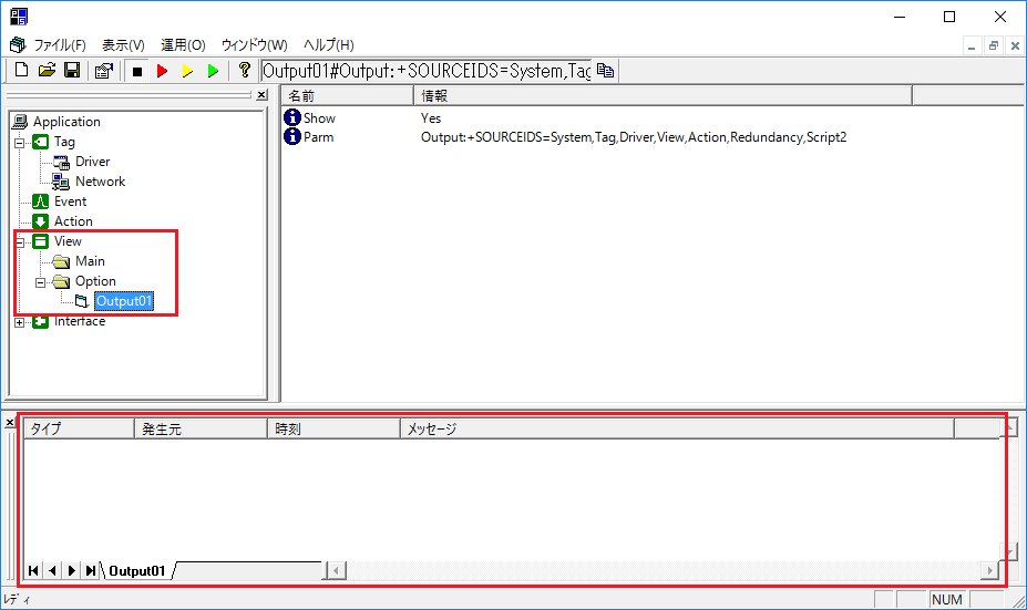 画面下部に表示されるビューです。デフォルトでアウトプットビューが表示されています。フッタービューは必要に応じて自由に追加することができます。フッタービューを追加するには、画面左のツリーから「View/Option」を右クリックすると表示されるメニューからの追加、又はフッタービューの以下の部分を右クリックすると表示されるメニューから追加することができます。