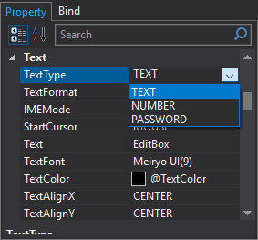 エディットボックスのプロパティには、“TextType”という重要なプロパティがあります。TextTypeの設定により、入力する文字に制約をもたせることができます。このプロパティで設定可能なタイプとしては、TEXT、NUMBER、PASSWORDの三種類です。TEXTは任意の文字列が入力可能、NUMBERは数値のみ入力可能、PASSWORDは入力した文字がアスタリスク“*”で表示されるようになります。