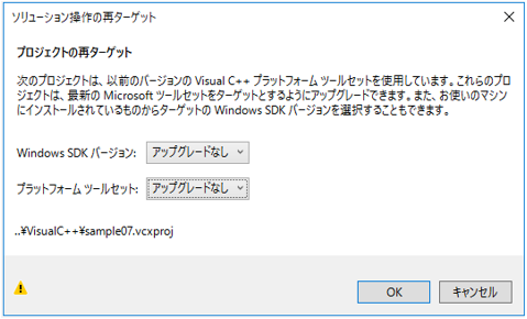 VisualStudio2010より新しいバージョンのVisualStudioを使用する場合、プロジェクトオープン時に下記のダイアログが表示される場合があります。