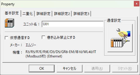 3.追加されたユニット(U01)のプロパティを開き、通信設定をクリックする