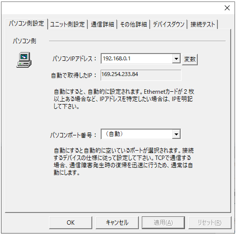 ※パソコン側の設定の大部分はユニット側の設定に合わせ込む形になります。