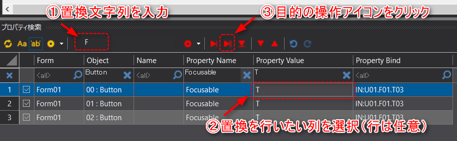 そして、検索結果リストで置換を行う対象の行の、置換を行う列を必ず選択状態にしてから、1行置換の操作アイコンをクリックします。この例ではProperty Value