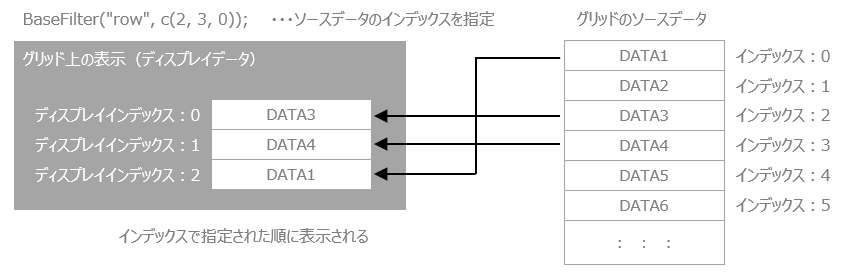 ベースフィルタとは、グリッドのソースデータの行(または列)のインデックスを指定して、指定したインデックスのデータのみをグリッド上に表示するフィルタ機能です。