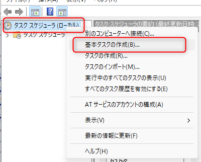 2.左側のツリーから「タスクスケジューラ」を右クリックし、表示されたメニューから「基本タスクの作成」を選択します。