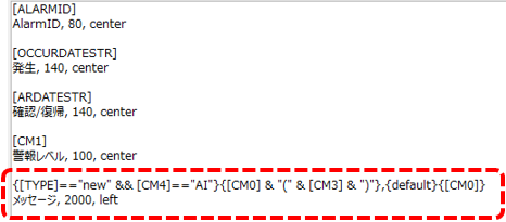 上記の設定例では、アラームマスタの列の末尾に新たに「CM4」という列を追加し、この列に「AI」か「DI」の区分を追加しています。アラームレイアウト側の設定で、CM4がAIのアラームについてのみメッセージに値を含めて表示するように改造を行います。