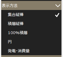 そして、表示方法には、「集合縦棒」「積層縦棒」「100%積層」「円」「発電・消費量」が用意されており、上記の各グラフ種別に対して、画面から自由に切り替えて表示を行うことができます。