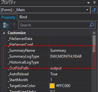 接続先などの設定は、エネルギー管理画面のメインフォーム「_Main」の以下のカスタムプロパティに対して行います。