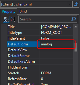 フォームの名称を変更したら、ルートプロパティのDefaultFormルートプロパティを「analog」に変更します。尚、複数のフォームがある環境で、起動時のフォームを別のフォームにしたい場合は左記の設定は不要です。