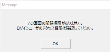 対象画面の表示の可否です。この権限を持たないユーザが対象画面を表示しようとした場合、以下のようなメッセージボックスが表示され、画面の表示がキャンセルされます。