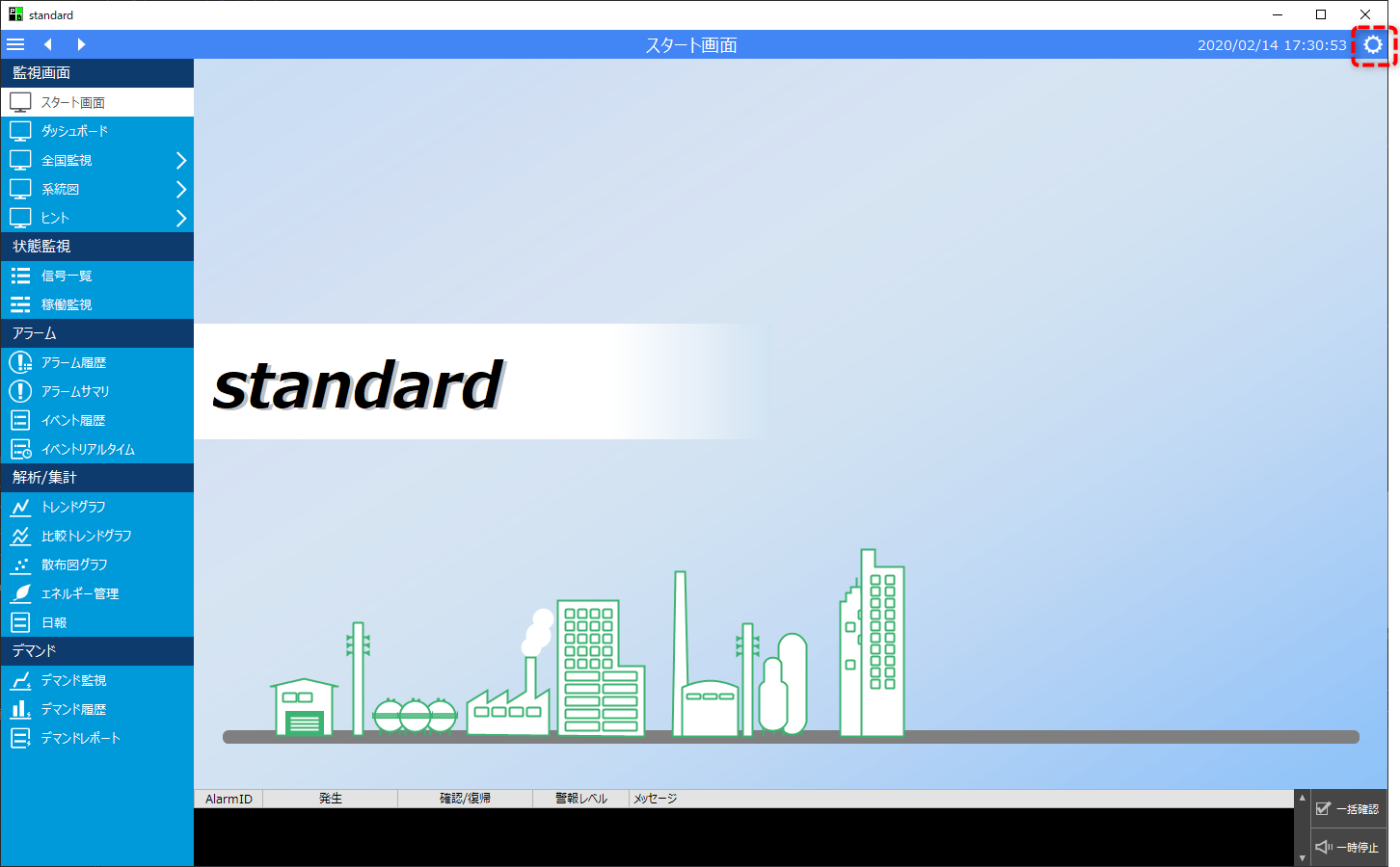 4.システム設定画面は、標準プロジェクトのインフォメーションバーなどに配置されている設定アイコンから表示することができます。