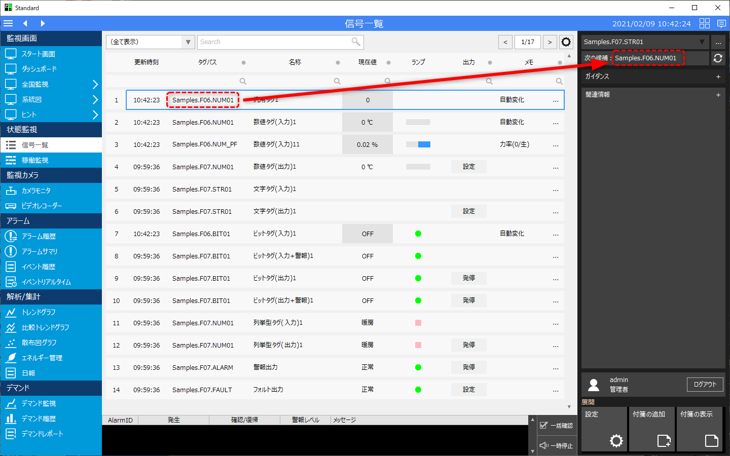 信号一覧やトレンドグラフ、アラームサマリなど、メインエリアの画面上でタグやアラームなどの何らかのデータが選択されると、インフォメーションバーの「次の候補」に情報が表示されます。