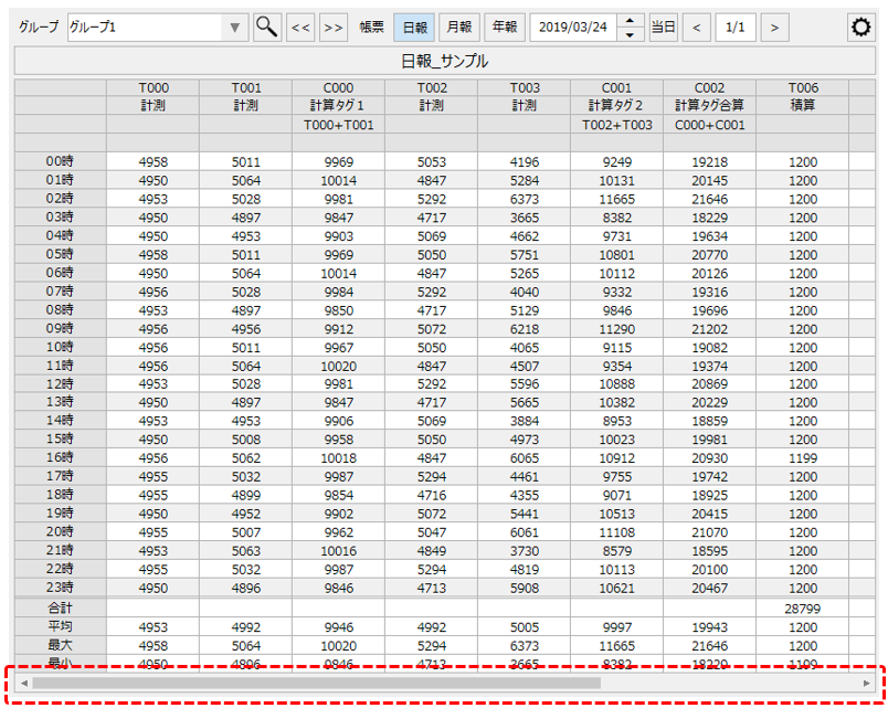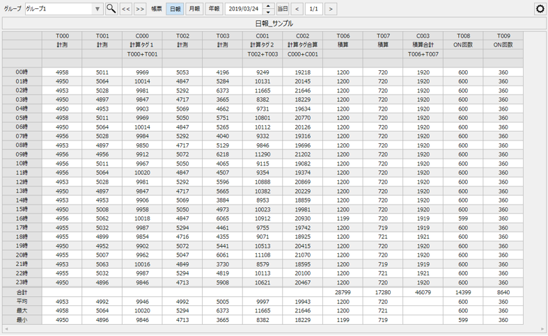 日報、月報、年報の行の末尾に、表示期間の「合計」「平均」「最大」「最小」を自動的に表示(印字)することができます。例えば日報の場合、1時間毎の集計データが24時間分、計24行の明細が表示されますが、その末尾に、1日分の合計、平均、最大、最小が表示されます。