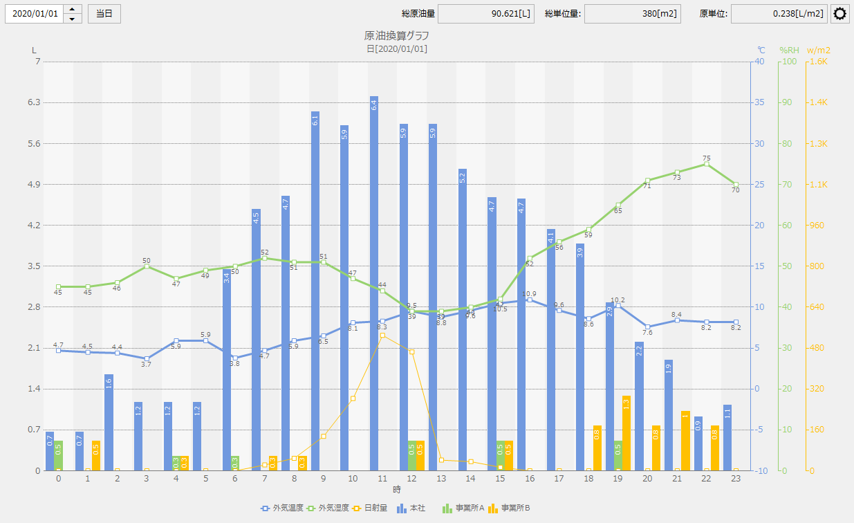 各種使用量を熱量(J(ジュール))に換算してグラフ表示します。画面の上部には総熱量、総単位量、原単位が表示されます。