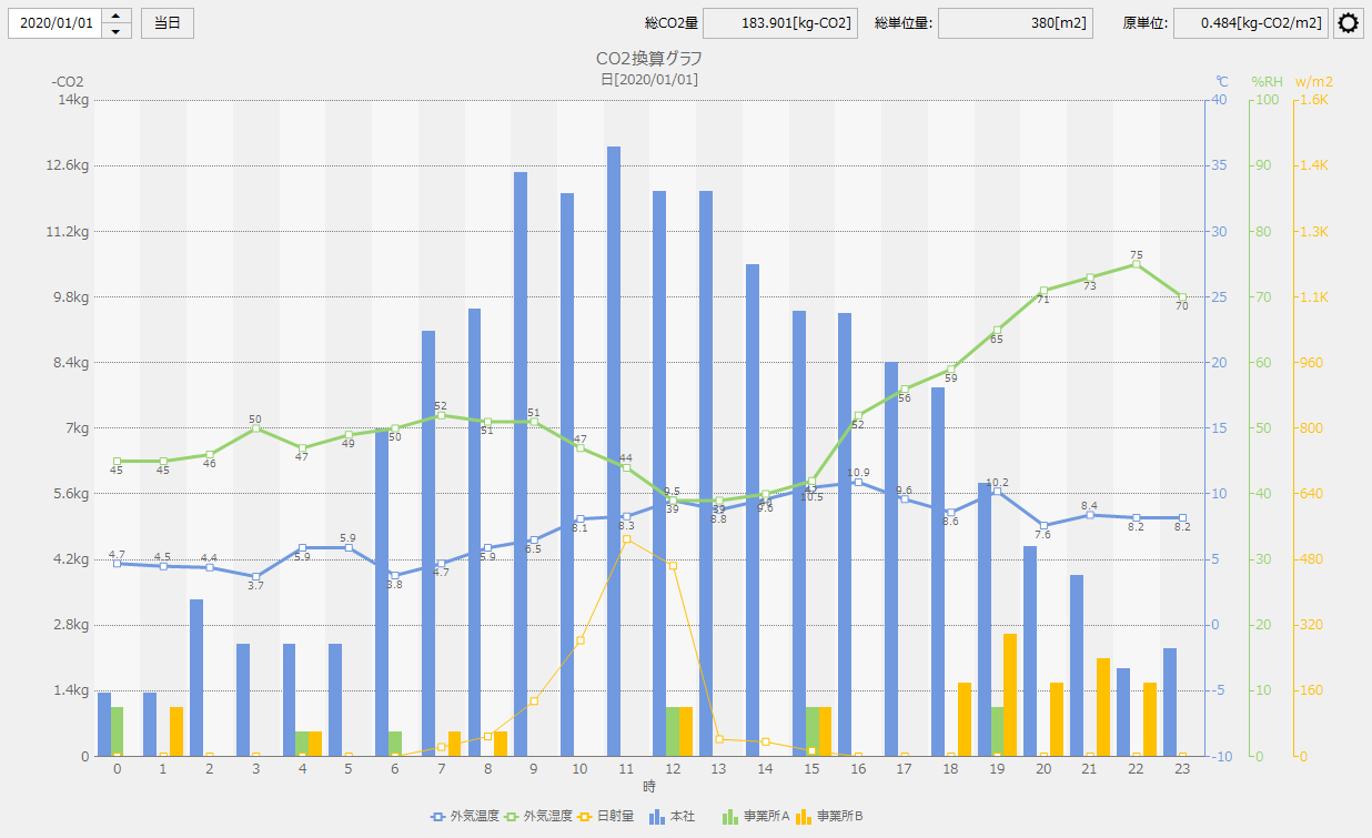 エネルギー換算したデータをさらに原油に換算してグラフ表示します。画面の上部には総原油量、総単位量、原単位が表示されます。 •CO2換算グラフ