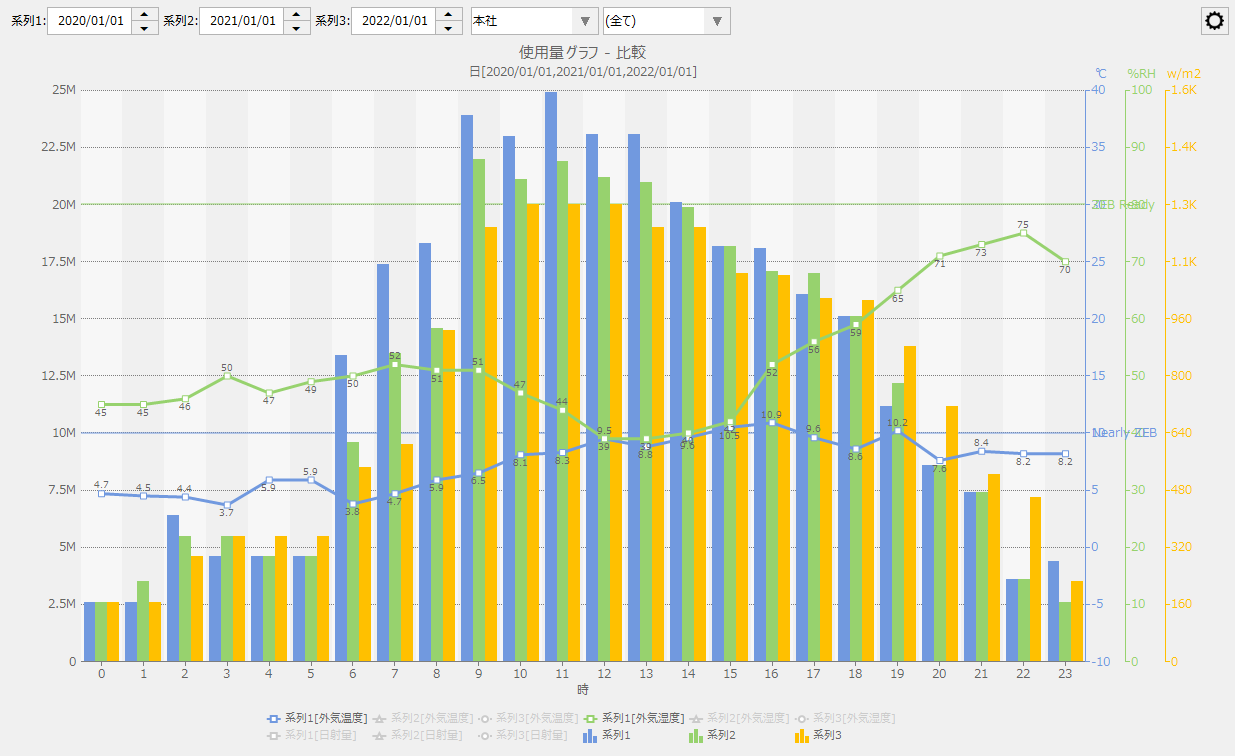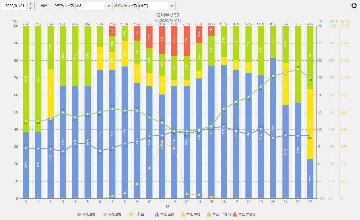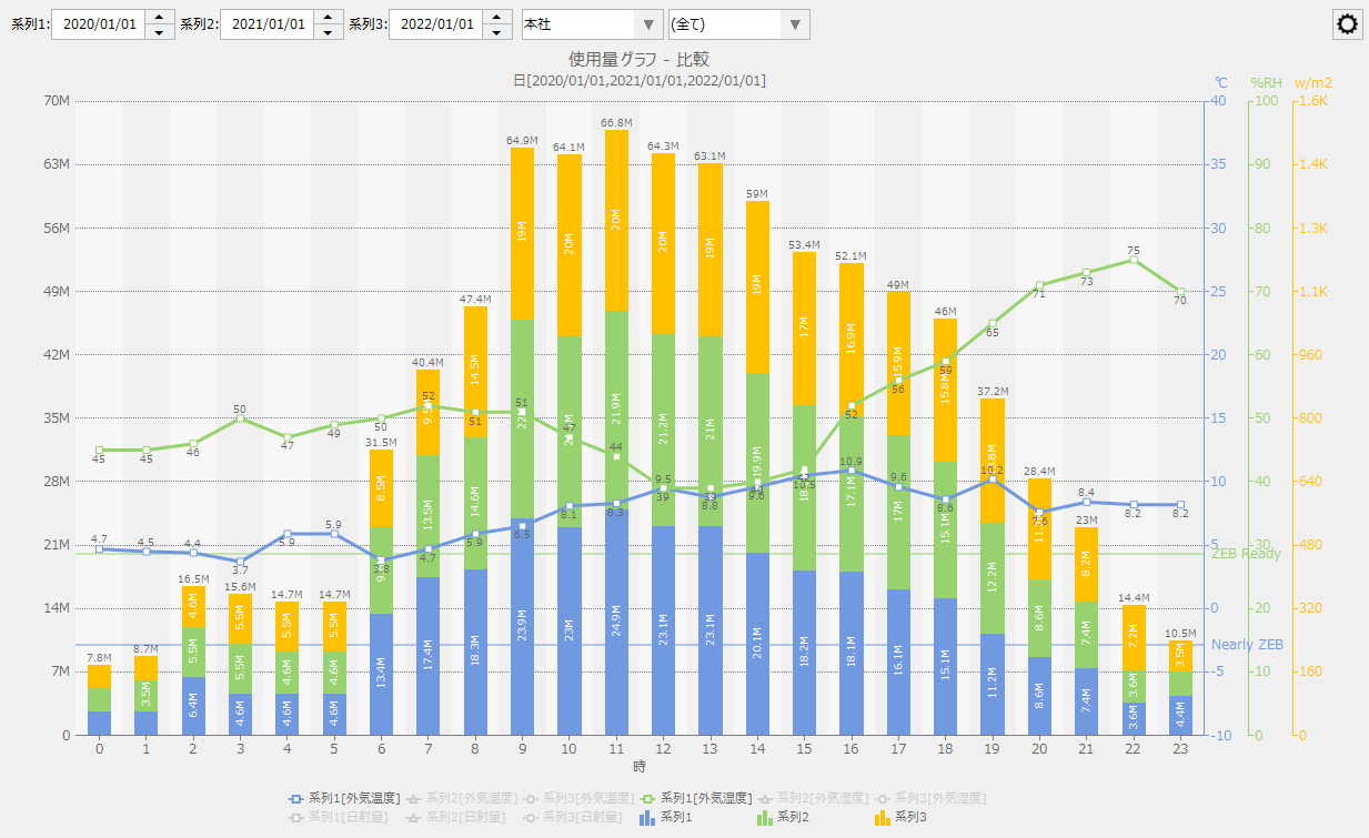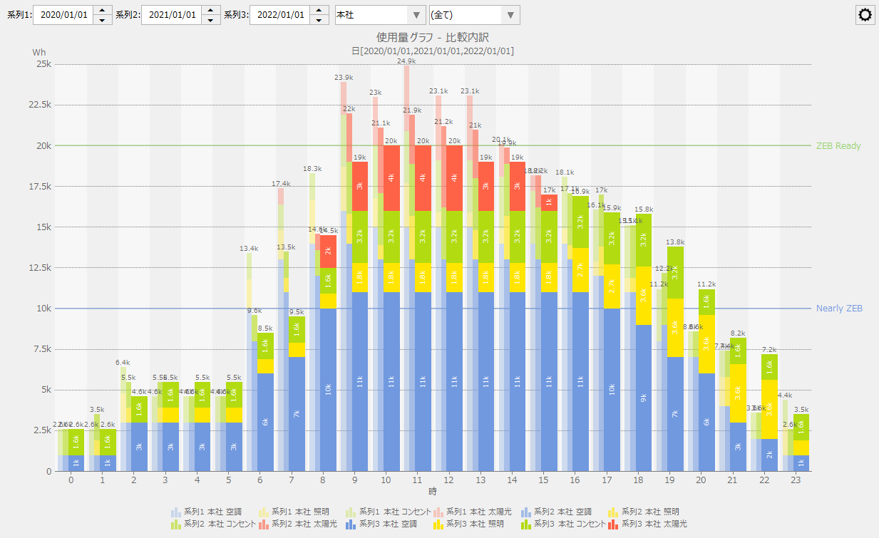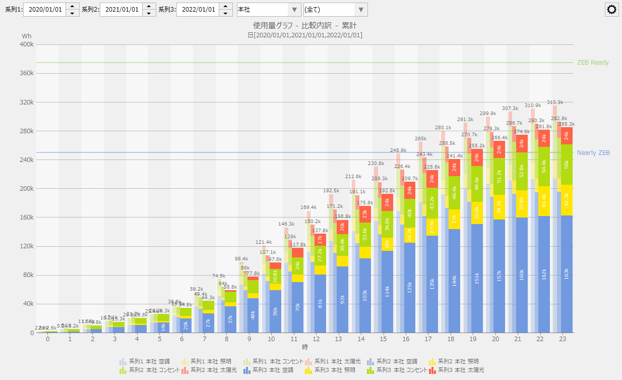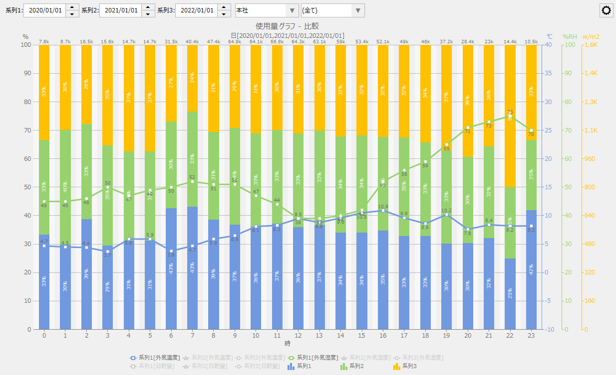 以下は、使用量グラフの複数点比較表示モードで、表示方法を「積層縦棒」とした例です。