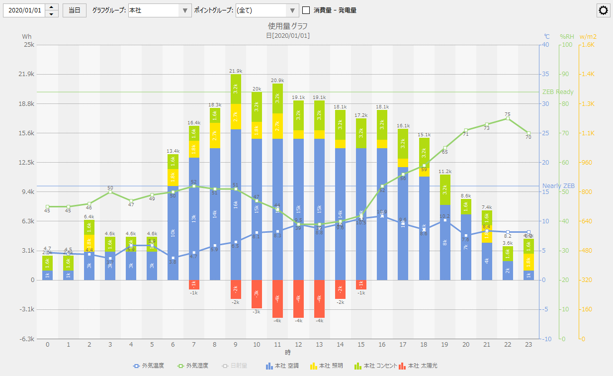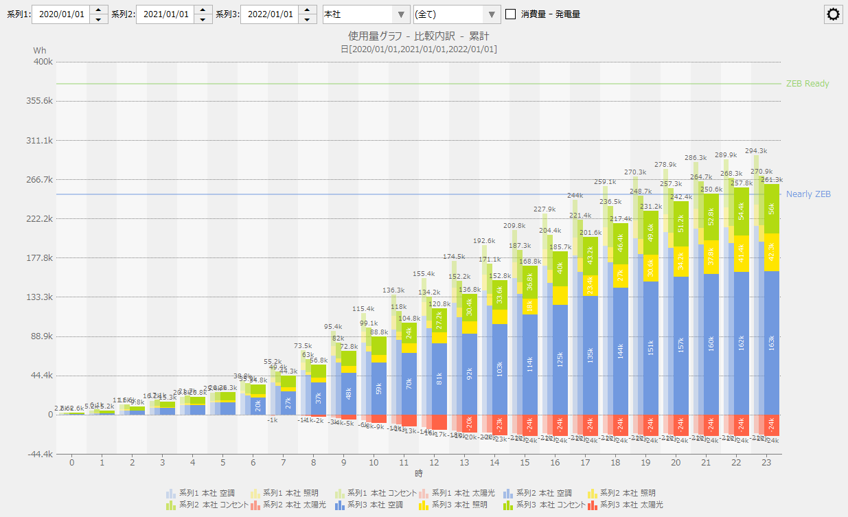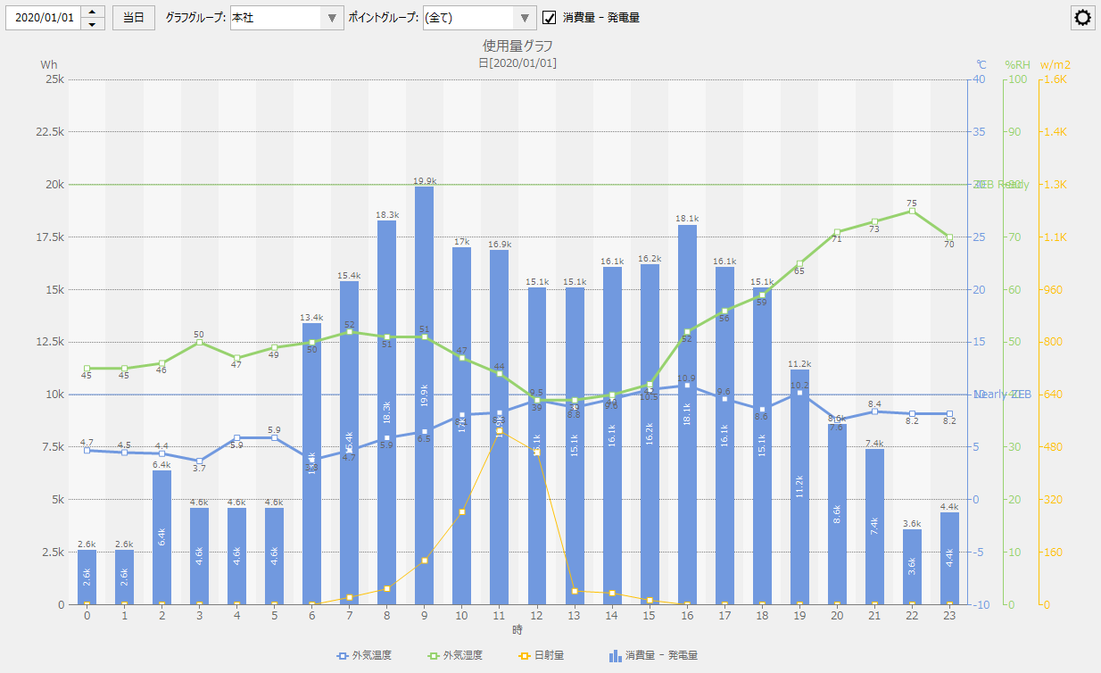 上記のチェックを入れると、消費量の合計から発電量(創エネルギー)の合計を差し引いた値でグラフが表示されます。