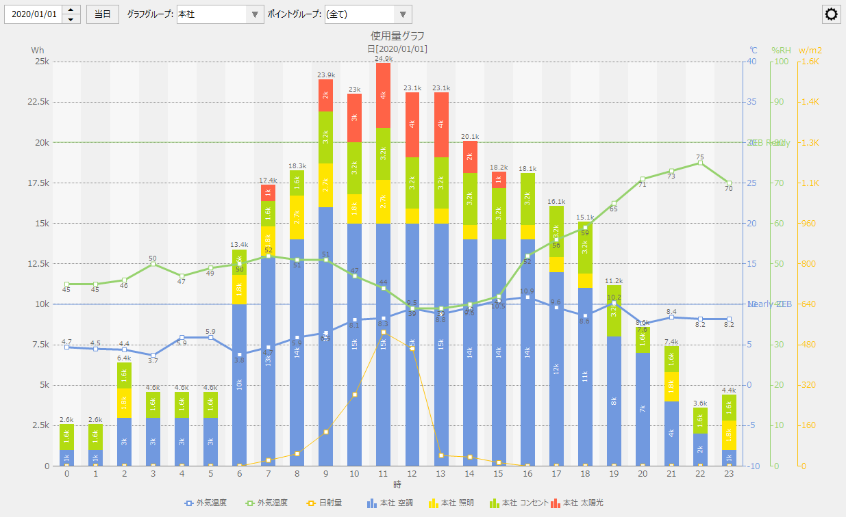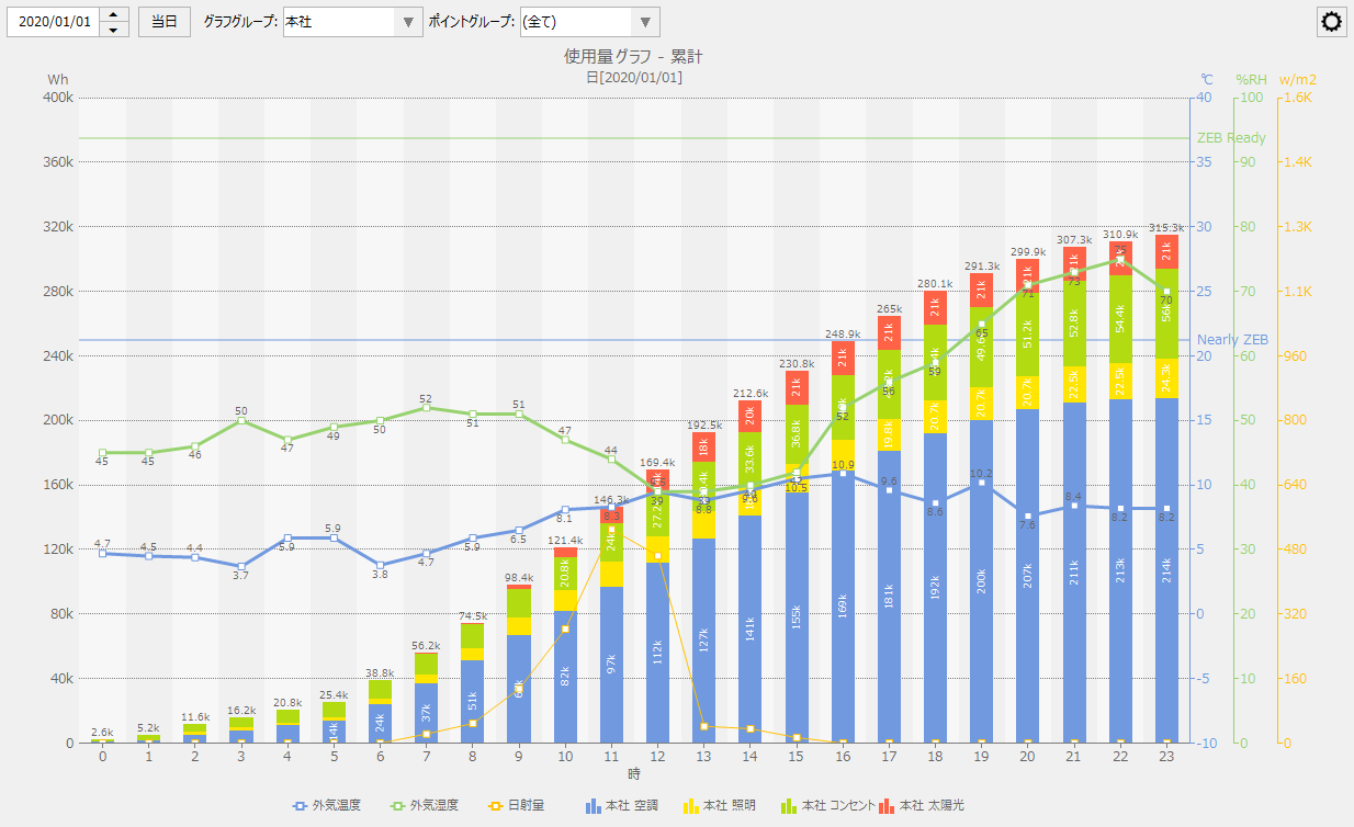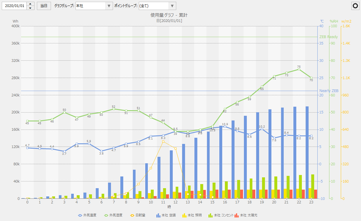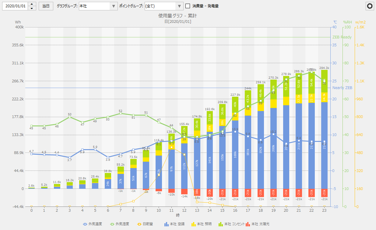上記のチェックを入れると、消費量の合計から発電量(創エネルギー)の合計を差し引いた値でグラフが表示されます。